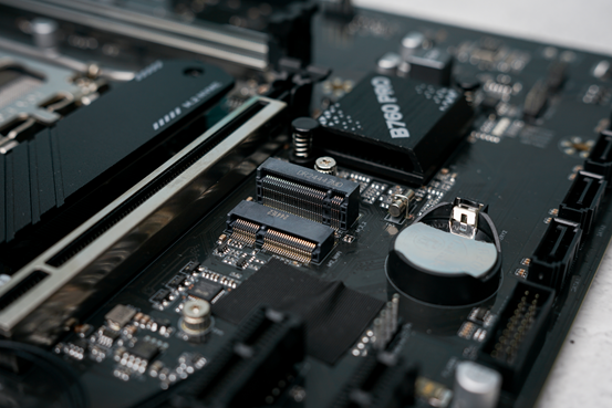 艾尔莎BOWMID B760 PRO D4的第二个M.2接口是在显卡槽的下方,它同样使用了2280的孔位,各种主流的M.2固态硬盘都可以安装。而在接口的旁边,我们可以看到一个M.2 Wi-Fi接口,该接口支持CNVi和PCIe协议的无线网卡,加装之后可以让台式机连接高速低延迟的无线网络。