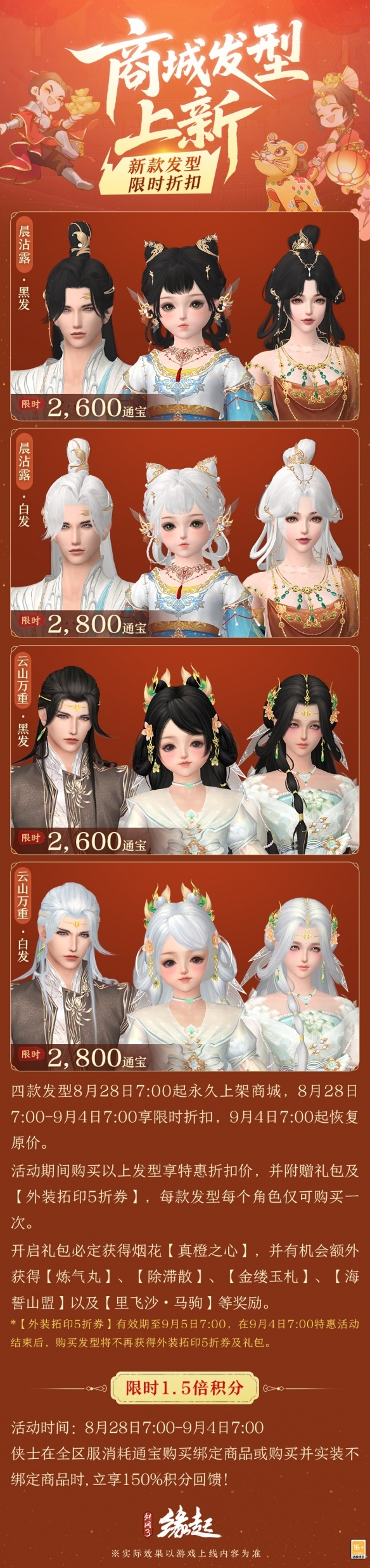 8月28日7:00-9月4日7:00活动期间,侠士在全区服消耗通宝购买绑定商品或购买并实装不绑定商品时,还可立享150%积分回馈!