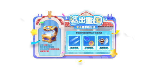 鲨出重围S14赛季通行证现已上线,解锁进阶版后获得拖尾特效、护盾特效、武器装扮等专属资源,达到80级后还可解锁高级资源宝箱,开启后获得传说品质武器、拖尾和护盾!