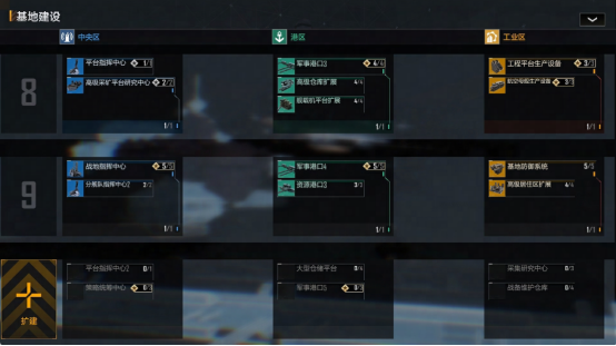 在基地达到等级7之前,扩建规则将维持现有不变,而在基地达到等级7之后,开拓者们将不再是对整个基地进行扩建,而是可以自主选择对中央区、港区或工业区中的某个区域进行针对性扩建。