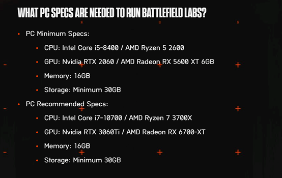 根据EA官方所提供的配置要求,《战地6》的最低配置要求是酷睿i5-8400处理器以及RTX2060显卡,推荐配置是酷睿i7-10700处理器以及RTX3060Ti显卡,整体要求还是有点高的,尤其是目前《战地》系列较为注重在线竞技,流畅度方面自然也是要尽可能地高,所以想要玩转《战地6》的话,最好还是使用高于推荐配置的硬件配置。