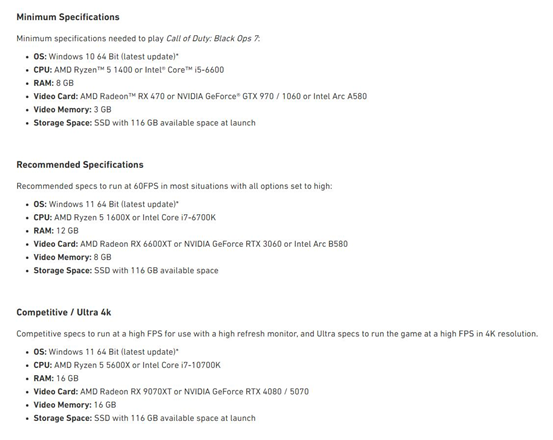 从动视官网所提供的配置要求可以看到,《使命召唤22:黑色行动7》的配置要求一共分为最低、推荐以及4K三档,其中最低一档的要求是酷睿i5-6600处理器以及GTX970显卡;推荐配置是酷睿i7-6700K处理器以及RTX3060显卡;4K配置要求是酷睿i7-10700K处理器以及RTX4080/5070显卡。门槛不高,但上限较高。考虑到目前大部分玩家都是以1K和2K屏为主,所以这里只要参考推荐配置进行装机即可。