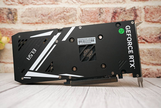艾尔莎BOMID RTX5060Ti幻雷者8GD7的背面是一块全金属的背板,背板上印有“GEFORCE RTX”、艾尔莎的品牌LOGO以及多个不规则造型的条纹装饰,颜值和做工都做到位了。