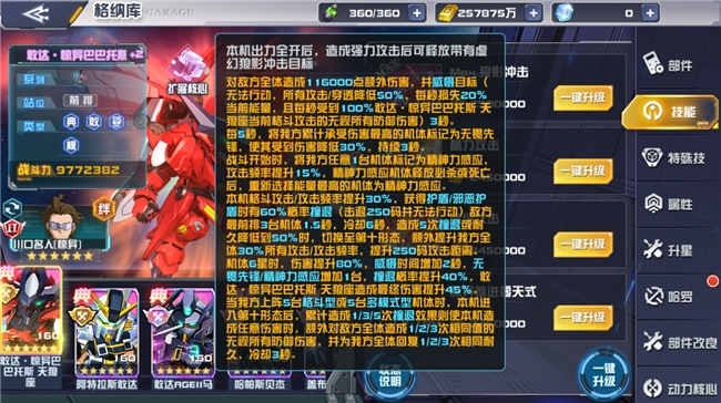 此外,机体的队长技“惊异之红”在我方上阵5台格斗型或多模式型机体时,能大幅压制敌方的能量回复与攻击频率,同时提升我方全体的格挡能力,形成显著的战术优势。其4技能“惊异推进器天式”更是为团队提供了强力的护盾支持与反制手段,尤其在面对高爆发阵容时表现突出。