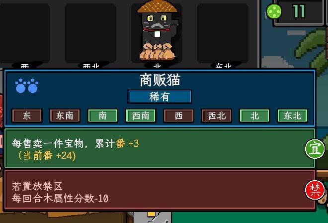 如果你完全没玩过麻将,或者只是麻将初学者,《风水喵将》绝对是你入门麻将的不二之选,你可以学会最基础的和牌方法,也能通过各种天马行空的想法让你的牌组更好打成某个和牌番种。比如我这一局就打算走万字清一色,那么我会拿各种能换成万字牌的“技能牌”以及一些增加万字牌分数的“宝物”。