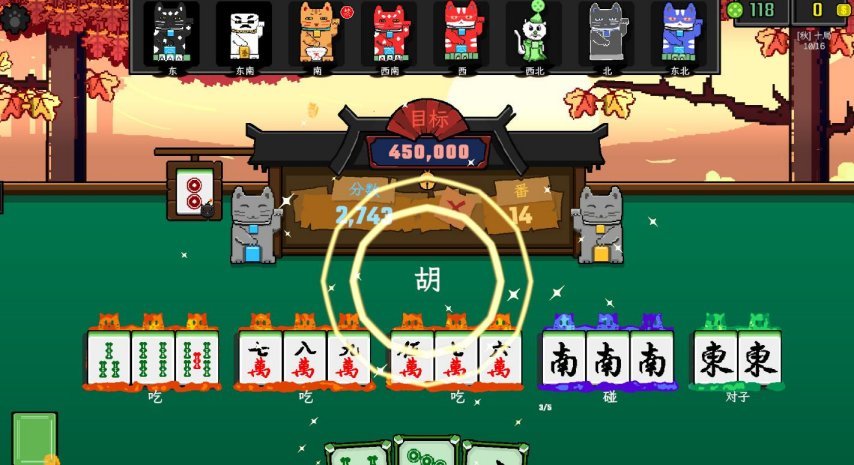 在《风水喵将》中,我们需要通过构筑不同的牌型进行得分,达到目标分数后,即可完成一小局的游戏,累计达成16小局的分数目标后,一轮游戏就算完成了,我们要做的就是不断组成分数更高的牌型,从而去达到每一小局越来越高的分数。