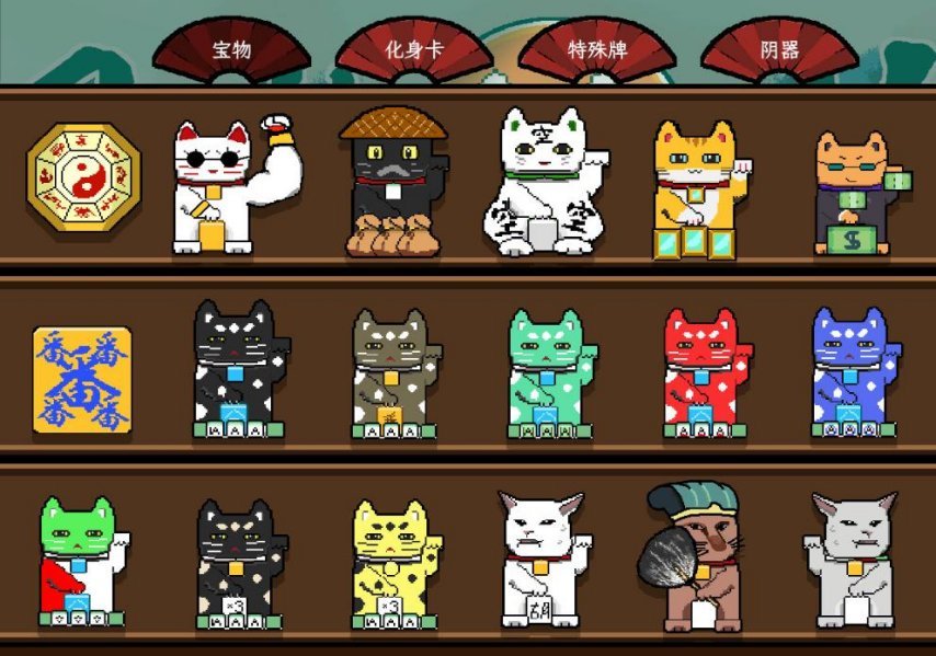 在每局游戏的过程中,我们除了利用“技能牌”进行牌库构筑,还有一个就是本作中最核心的玩法——猫meme宝物!在麻将和猫meme能有什么关系呢?看起可爱、搞笑的猫meme就是你每局能否拿到高分的关键!