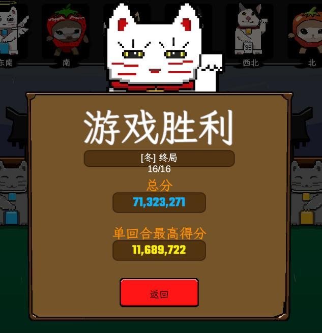 在现实中我打麻将从来没有和过什么大四喜、大三元这种牌,但是在《风水喵将》,看着我辛辛苦苦构筑多轮和出一手大四喜,倍率直接拉满、分数飙升,简直爽翻了!这款游戏作为一款轻Rogue棋牌游戏,它并没有《月圆之夜》的卡牌战斗系统和剧情,而是完全靠着麻将构筑来吸引玩家,再通过其极其有深度的构筑来留住玩家。