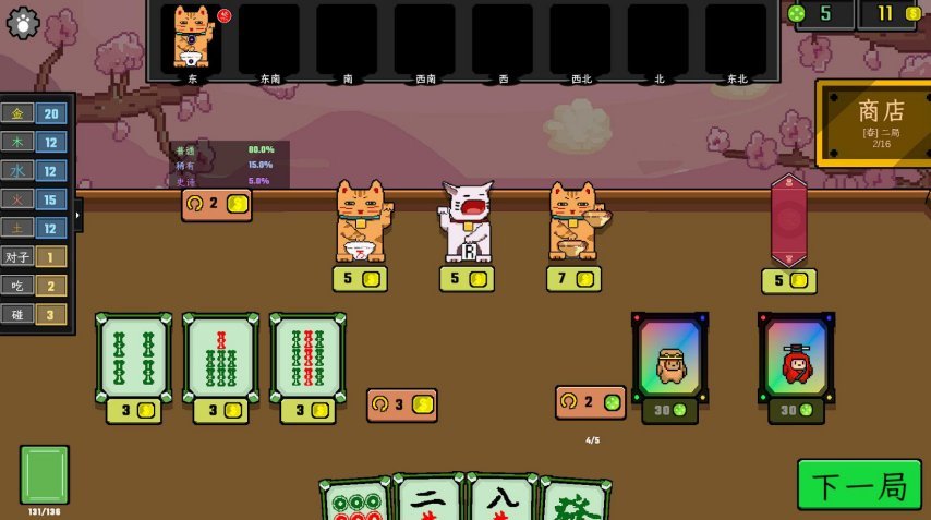 在每一小局中,使用越少的回合数达成目标分数,获得的奖励金币就越多,后续商店购物也更游刃有余 —— 但这种‘良性循环’并非稳赚不赔,毕竟麻将自带的‘运气属性’在这里也没缺席:商店商品的刷新完全随机,很可能你在做条子清一色时,连续两三局刷不到相关道具,那这一轮基本就宣告失败了。