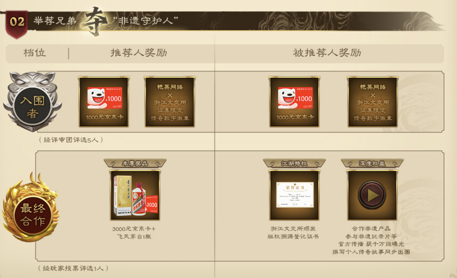 据了解,“了不起的传奇人”活动现已开放报名,面向全国同时具备非遗技艺和传奇游戏情怀的传承人展开征集。参与者将经历作品提交、专家评审、玩家投票等多轮环节,最终胜出者不仅将获得浙江文交所的权威认证,还有机会与官方合作开发定制内容,并参与非遗主题纪录片的拍摄。
