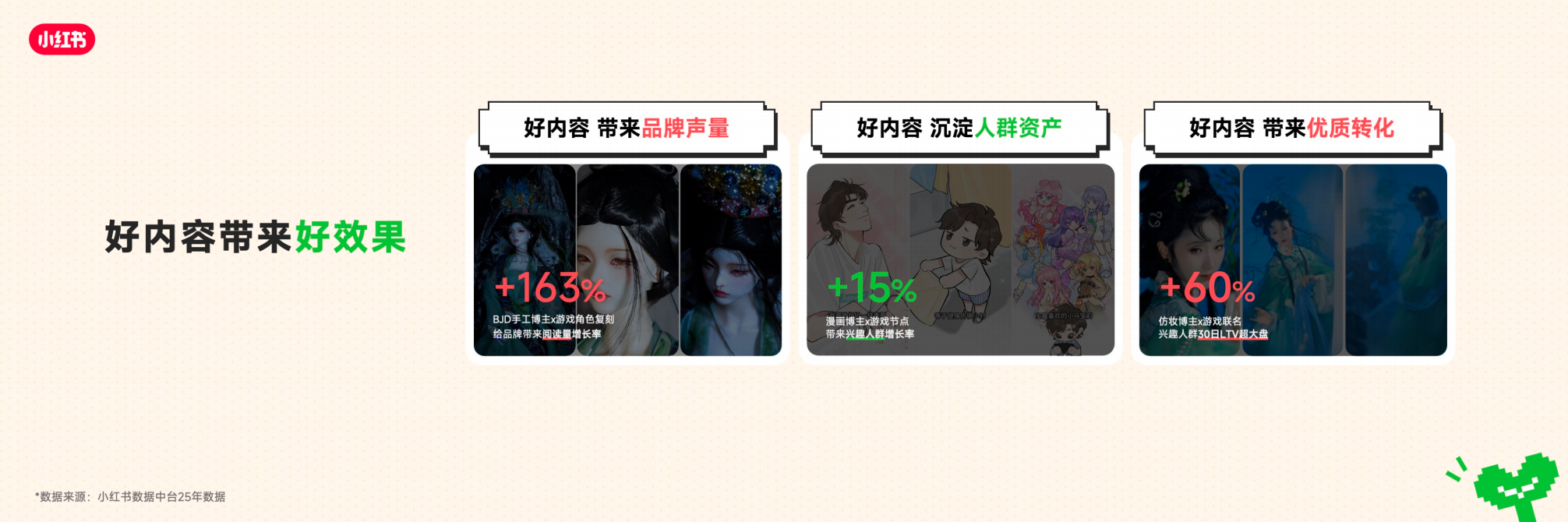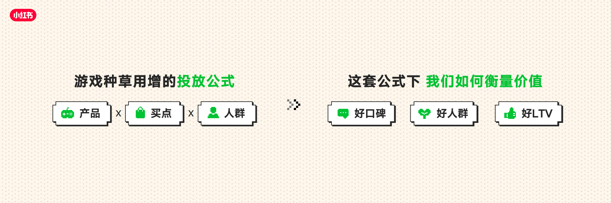 • 在小红书实现高质量用户增长的游戏品牌,都跳脱出短期数据桎梏,以细分人群洞察锚定买点,打造好内容,收获长效增长与好口碑。