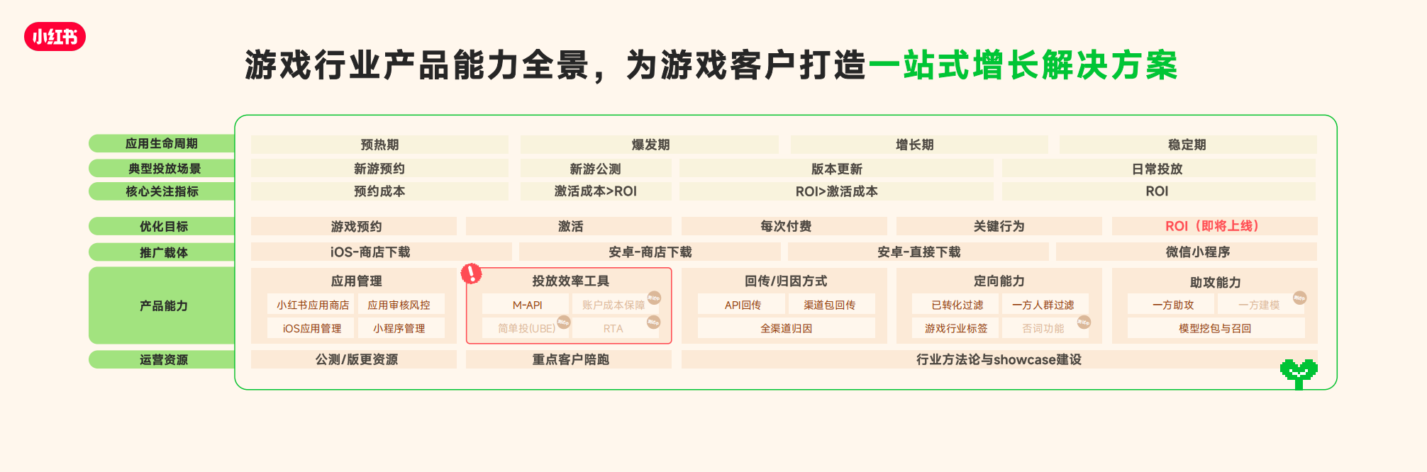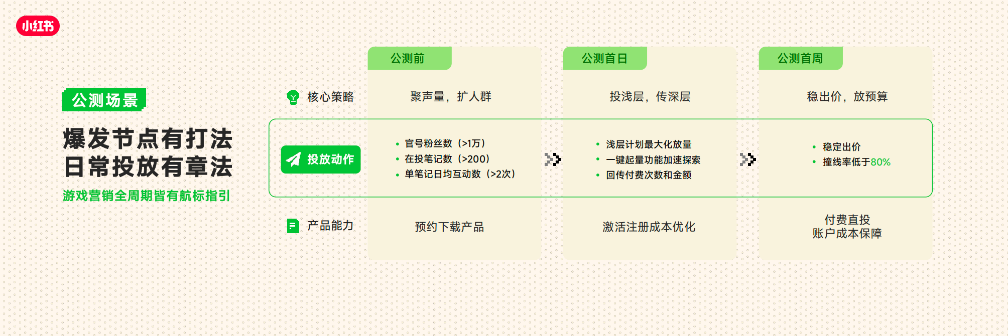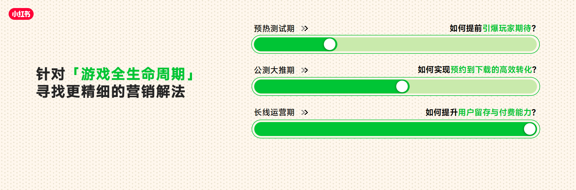 • 同时我们也针对游戏全生命周期(覆盖预热测试期、公测大推期、长线运营期),提供了精细化的营销解法。让增长不再是单点爆发的博弈,而是成为可孵化可经营的长久生意,打造小红书成为覆盖游戏全生命周期的高价值用户运营阵地。