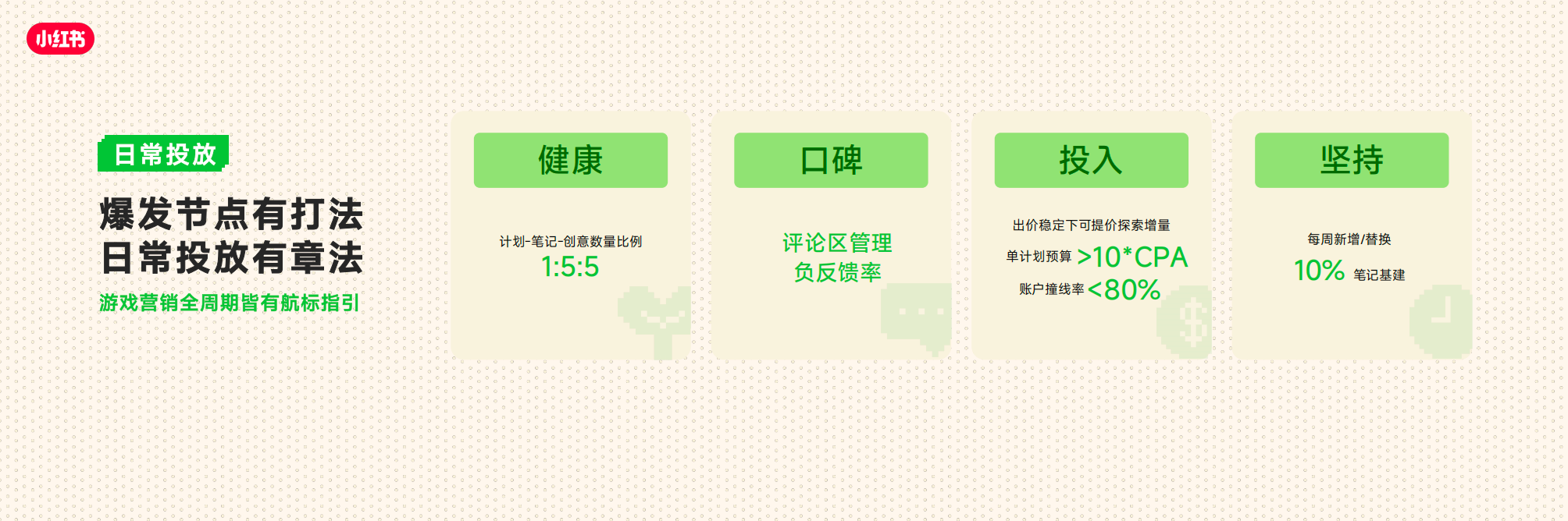 • 游戏行业的增长破局,关键在于精准洞察玩家需求,通过“产品×买点×人群”的科学种草用增投放公式,实现细分人群需求与场景的精准匹配。
