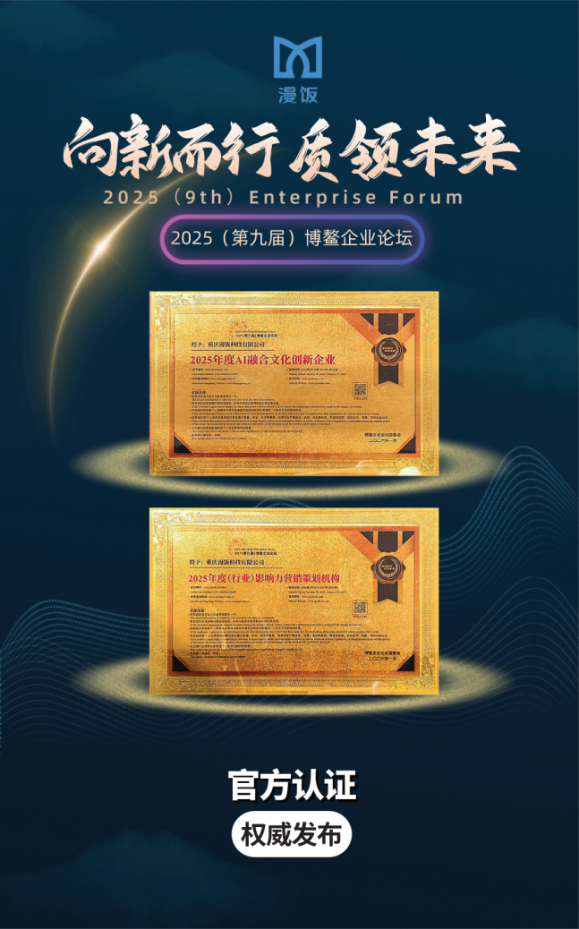 2026年1月,漫饭在第九届博鳌论坛上斩获双奖,“2025年度AI融合文化创新企业”“2025年度(行业)影响力营销策划机构”是各领域一流企业和组织对漫饭认可的证明。