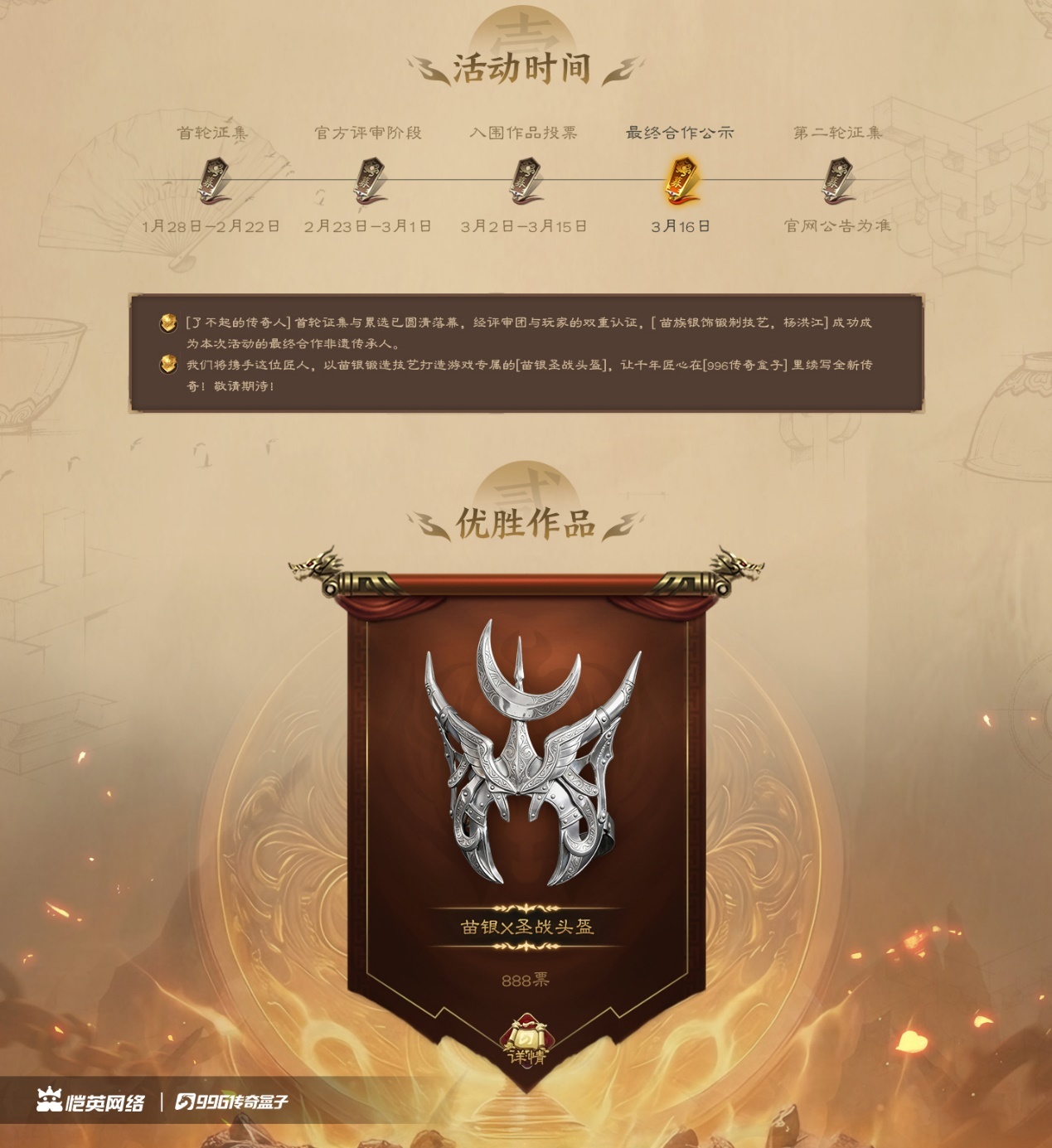 今年1月底,恺英网络旗下996传奇盒子与浙江文交所联合启动“了不起的传奇人”项目。经过前期报名、筛选与投票,湘西苗族银饰锻造技艺与圣战头盔的结合,得到了广泛认可。在湖南游戏公会会长的推荐下,苗族银饰锻制技艺省级代表性传承人杨洪江大师与996传奇盒子携手,将游戏内的经典装备“圣战头盔”以苗银工艺进行实体化锻造。记录这一过程的专题纪录片将于4月底正式上线。