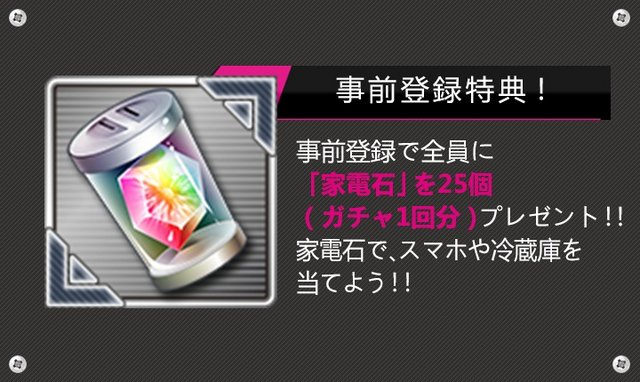 而本作事前登录活动也从即日起正式开跑,所有登录的玩家都能获得25颗名为「家电石」的游戏通货,其数量刚好可以让玩家在一开始就拥有一次转蛋机会。想在游戏开头就获得强力角色的读者们可别错过这个机会喔!