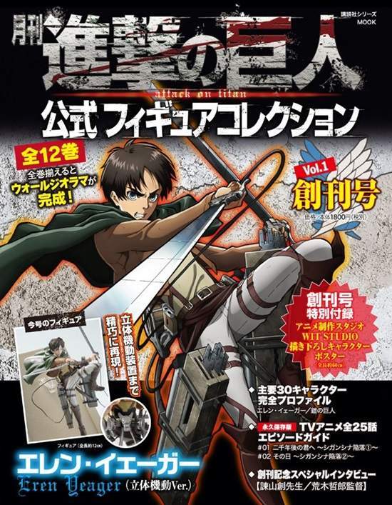 在「进击的巨人」动画第二期开播之前,官方还是决定先来挣点零花钱——推出手办MOOK创刊!这是让粉丝一边收集手办,一边等待2016年动画的开播!在4月8日讲谈社将创刊并出版一本名为「月刊 進撃の巨人 公式フィギュアコレクション」(月刊 进击的巨人 官方手办收藏)的MOOK。从已经公开的创刊号封面获悉,该刊将全面彻底介绍25集TV动画的故事及角色,收录谏山创和动画导演荒木哲郎访谈,而且还附各种角色模型。一整年下来就可以用收集到的角色摆出壮观的战斗场景。该本月刊以后每月的8号发行一本,共12本。每本售价1944日元。