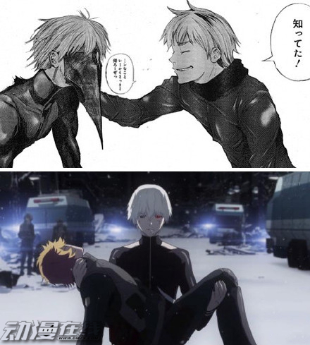 为何说我们都想找编剧出来谈谈人呢?除了虐,还有一点就是,如果你看了漫画版《东京食尸鬼√A》最终话后,再看动画版《东京食尸鬼√A》最终话,你会彻底的想找动画制作出来揍一次。因为动画版最最终话与漫画版的结局不一样,漫画英拯救了发狂的金木,随后就之后下落不明。