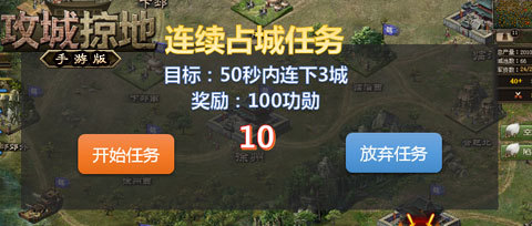 在《攻城掠地》手游2.4版中,玩家在游戏世界中占领一座城池后,有一定概率触发占城连续占城任务。触发后,系统会询问玩家是否想在规定时间内占领规定数量的敌方城池。玩家需要在10秒内进行判断,选否则任务不开始;玩家选是,则倒计时开始。玩家需要在倒计时结束前占领规定数量的城池。10秒结束不选则默认选否。如果限制时间内玩家达成任务目标,则停止计时领取奖励;倒计时结束时没有达成目标,任务结束。当天内,任务目标会随着任务完成次数增加而越来越难。