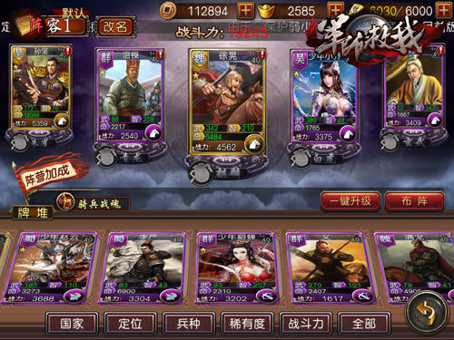 当主公等级达到22级时,会解锁五个上阵英雄的卡位,上阵有某种共同特征的武将会有相应的加成,可以提升整支队伍的整体战斗力。如果组成同一国家的阵容,就可以获得一定的阵容加成。再配合各个兵种间的搭配,可以提升战斗力,让战斗更简单。