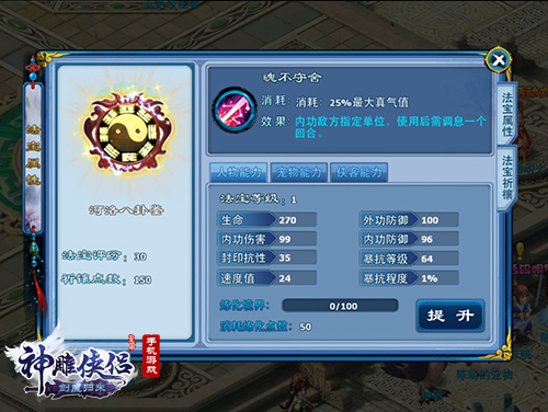 还在冗余材料太多,包包不够用,丢了太可惜嘛?《神雕侠侣》全新资料片帮你“变废为宝”。新版本推出法宝系统,七大门派,七大法宝为你和你的随身小伙伴提供不同的属性加成,让你的武学境界再度提升。90级后,玩家将接到一个分支任务,与门派导师对话,解锁法宝功能,完成法宝支线任务后,即可激活法宝人物、宠物以及侠客的能力加成。通过法宝强化,可以大幅提升人物、宠物和侠客的能力。这就够了吗?NO,各类法宝不仅造型炫酷,自身还带有不同的法宝技能,助你瞬间扭转战局。