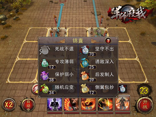在阵容界面,主公可以点击上阵武将的左下角灰色图标,就可以为武将佩戴上锦囊了。在游戏过程中,可以得到不少诸如“听说赵云佩戴坚守不出非常厉害哦”的小提示,主公可以根据提示和实战经验,为各位上阵武将佩戴合适的锦囊。除此之外,开战之前,还可以先观察敌方阵型,在开战倒计时结束前为武将更换锦囊。卸下锦囊也非常容易,只需选择锦囊“死战不退”便可以轻松取消。