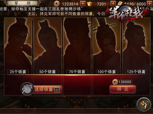 锦囊妙计作为游戏中必备良品,其获取方式也是多样的。首先,主公可以在主城的最左侧“拜见军师”,花费少量元宝可以得到心意的锦囊,但数量是随机的,而花费一定数量的铜钱则可以获得随机数量的随机锦囊。当主公运气爆棚时,不妨多来试试!其次,主公还可以在擂台中使用声望兑换指定锦囊。最后,通过等级礼包也能获得锦囊,但数量较少,建议主公们还是多使用前两种方式。