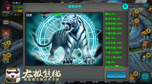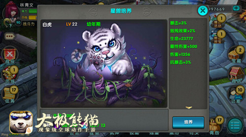 《太极熊猫》中星兽系统作为辅助,可以为玩家带来强大的收益。青龙宝宝在勇士们的悉心培育之下,如今已经能够独当一面,第二只星兽宝宝白虎马上也将孵化完成。全新加入的白虎星兽出生时可能还比较弱小,幼年白虎外表呆萌可爱,属性收益对于前期玩家而言,不算突出,但是只要多加培养,进化为完全体之后则是霸气外露,属性直线飙升,瞬间进化为神兽。