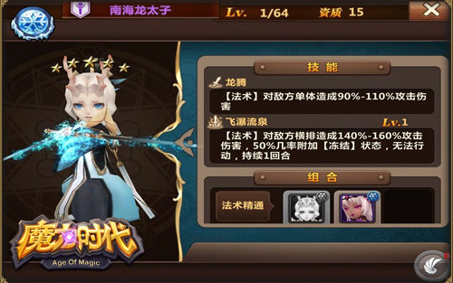 龙太子资质高达15,是紫将中的顶级存在,外型吸睛的他实力也是不容小觑的。普通攻击“龙腾”对敌方后排单体造成90%-110%攻击伤害;怒气技能“龙卷雨击”对敌方横排造成140%-160%攻击伤害,50%几率附加【冻结】状态,无法行动,持续1回合。从技能分析,可以看出龙太子定位为高输出角色,是队伍中强力的后排输出水系强者。