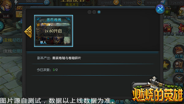 玩家等级达到60级时,可以开启“无尽战线”功能,点击主界面“挑战”可以进入“无尽战线”界面。“无尽战线”为单人模式,玩家每天有2次免费挑战机会,每通关5层会获得一次奖励,奖励主要为装备熔铸所需的卷轴材料。