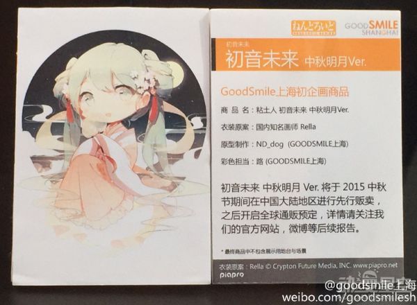 本次将要推出的中国风手办初音未来 中秋明月ver的原画师也是中国人,这款美美的中国风作品原画师是国人画师Rella,本次初音的服装就是取自Rella的原画。根据官方的消息,初音未来 中秋明月ver粘土人将于中国中秋节期间首先在中国大陆地区先行发售,之后在全世界开启通贩预定。好期待啊~