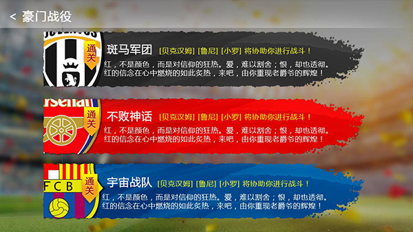 在这个玩法里面,一共有15支豪门球队(恒大竟然也算进来了,估计是照顾恒大球迷),每个豪门对应的有4个任务。任务首次完成都会给50到100宝石不等的奖励和获得某些经典球员的道具。这个地方可以看到非常多的S+球员,而且在完成任务的过程中这些S+球员会临时租借(免费)到你的球队中,不过这个战役里面的难度确实有点大,有些任务甚至可能要尝试多次才能完成。