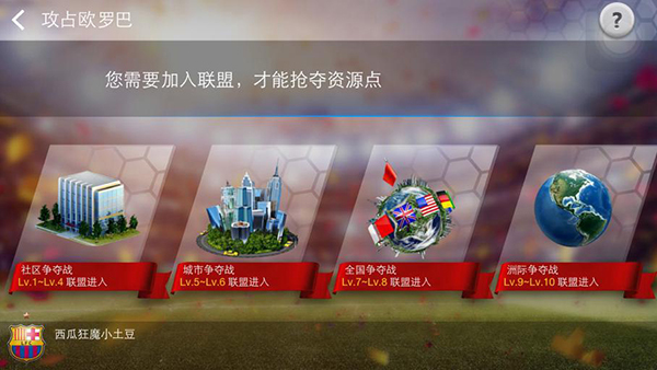在攻占欧罗巴里面,首先一个条件就是加入一个1级以上的联盟。然后就可以代表联盟进行比赛了。这个活动目前是在每周六都会开放,从早晨8点开始到晚上10点结束。每次开放都有5次挑战机会。比赛的方式跟名字非常像,就是率领自己的球队去占领可以产出各种资源的据点。占领之后会有5分钟的保护时间,之后就会受到其他联盟的挑战了,如果比赛失败,据点就会被别人抢走。占领了资源点后得到对应的资源,资源的多少由占领的时间决定,时间越长,奖励就越多。个人感觉这个占领的过程还是十分紧张的。保护时间以后,我基本过1分钟就要看一次,然后调整调整战术什么的,避免被别人试探出来把我打下来。