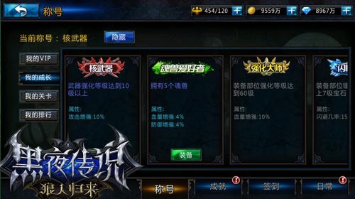 达成一定的成就(如排行榜前列、通关某关卡、VIP等级等)即可获得特定个性美观称号,可显示在主城彰显尊贵身份,并有强大属性加成!