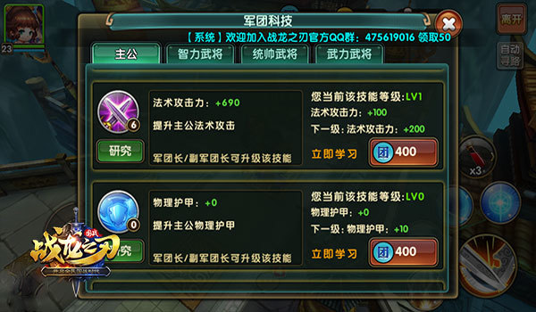 军团科技馆提供了各种武将技能,由团长、副团长对技能通过研究提升技能等级,供军团成员学习。根据角色和武将的属性类别,选择对应的技能学习,达到额外的属性加成,最终提升战队的整体能力。