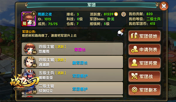 物以类聚,人以群分,志同道合的英雄就该一起创造梦想!加入军团,找到属于自己的组织。《战龙之刃》军团系统,为各位主公提供了组织,在军团中,有专属的军团领地、有庞大的军团战役、还有充满刺激和挑战的军团副本。谈谋略,朝堂上可见分晓,论英雄,战场上方明真相,加入军团,加入英雄的战场。