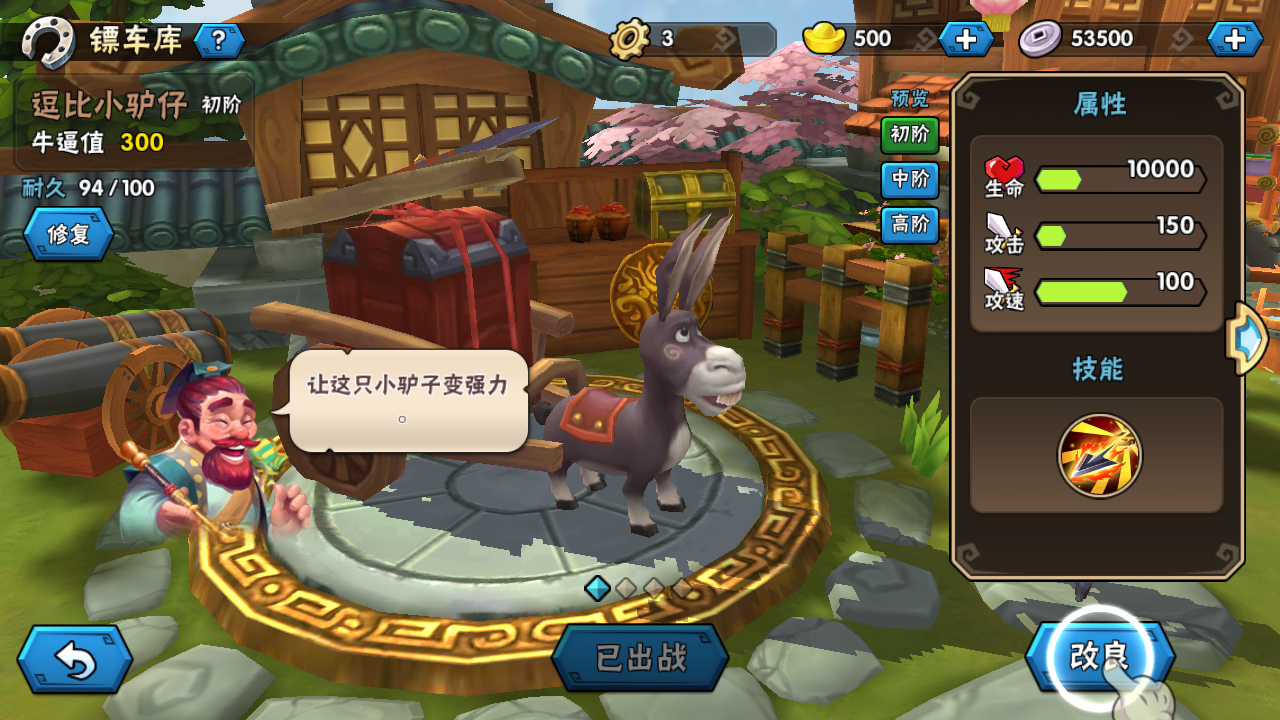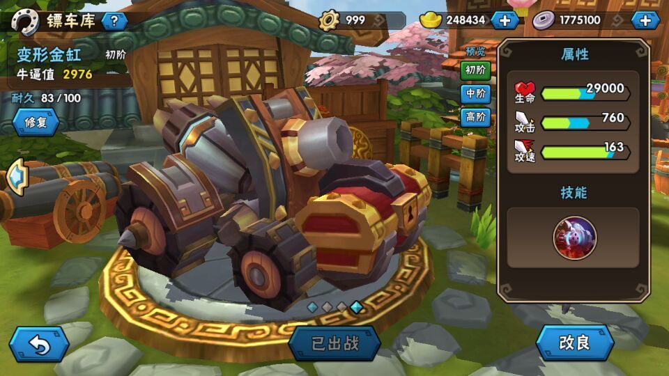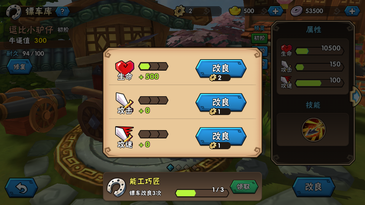 每一款镖车分为初阶,中阶和高阶。点击改良按键,使用齿轮可提升镖车属性,提高镖车战斗力。在其生命、攻击、攻速满值后即可进阶。
