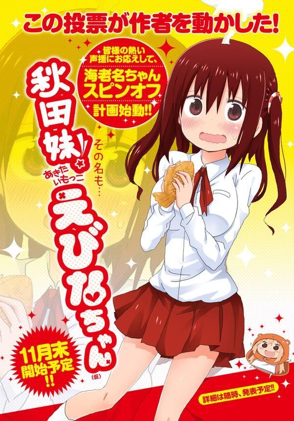 之前有一篇新闻是说日本70%的男性喜欢吃货妹子,在二次元中吃货就是一种妹子特有的萌属性,如果再加上巨乳的身材与害羞的性格简直就是众多阿宅心目中的理想情人,在《干物妹小埋》的官方角色人气投票中有着巨乳害羞吃货属性的海老名酱就成功获得人气榜榜首的位置,下个月开始以海老名为主角的干物妹小埋漫画将会正式开始连载。