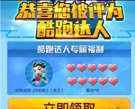 一旦玩家成为酷跑达人之后玩家可以获得闪电骑士和10个爱心哦。