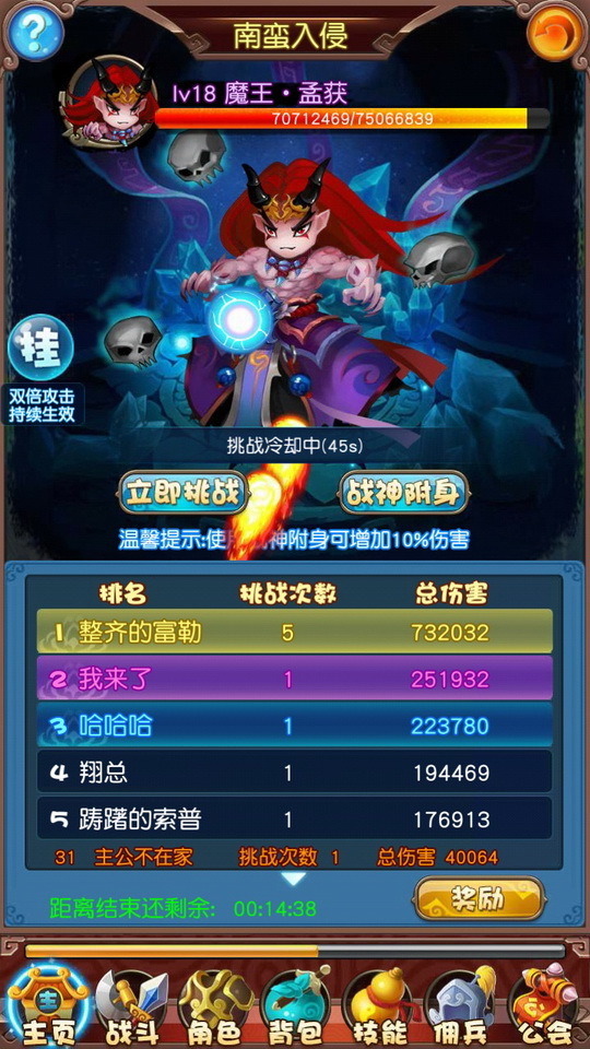 乱世纷争,三国鼎立。魔神孟获作为游戏中的世界BOSS,一直是玩家们抗争的对象。只有全服玩家齐心合力才有机会将其击败获得巨量的道具奖励。而游戏的放置类玩法,不仅释放了玩家们的双手,同时给玩家们带来无穷的乐趣。