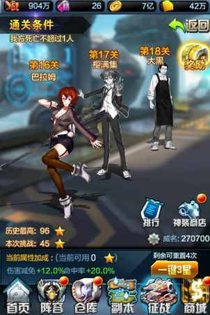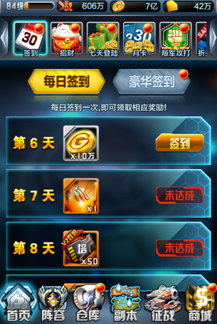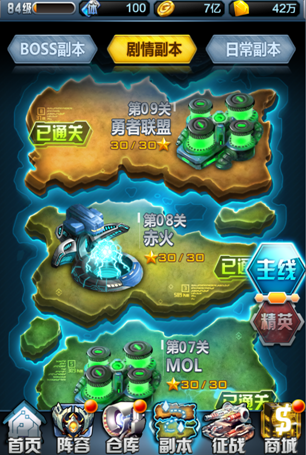 游戏中的副本分为三类:剧情副本、boss副本和日常副本。三种副本一方面是增加游戏体验,另一方面是是有不同的资源产出,这对游戏的长期发展的影响非常重大。经过一段时间的评测体验,还是能感受出开发团队的“平衡之术”。一方面,为了吸引玩家,这些副本的产出必须要多。例如,剧情副本中可以获得坦克碎片和装备碎片;boss副本,每场战斗取得首次胜利都会得到大量元宝奖励。