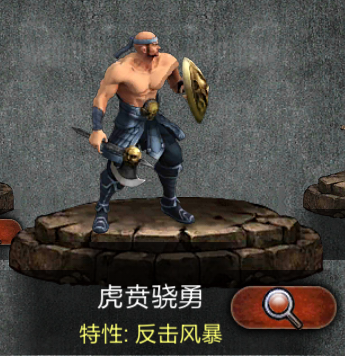 ①虎贲骁勇:反击风暴,受到攻击有25%的概率减免50%伤害,并使攻击方损失初始10%的兵力