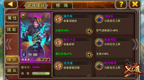 在《X三国》中,暂时还没有其他黄巾军的英雄出场!以三国关系来配缘分的话,有那么一点牵强!不过,这也能让主公们脑洞大开,完全凭借自己喜好来打造张角的阵容!谁说农民起义就是反贼?张角也能够和正义化身“蜀国桃园系”武将一起战斗的!
