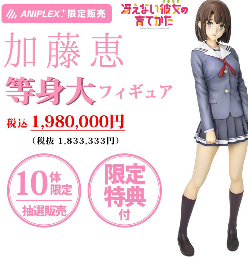 《路人女主的养成方法》这部作品的剧情发展到现在,加藤惠可谓是最大的赢家,圣人惠以不变应万变,管你是黑丝学姐还是败犬青梅竹马,圣人惠屹立不倒,在今天路人女主官方于著名的秋叶原 UDX 开设路人女主 2016 SHOP,现场将展示京都国际动画展上推出的路人女主和服手办还有等身大的加藤惠模型,Aniplex 现在公开了等身大圣人惠模型的售价,只要198万日元圣人惠就有机会带回家。