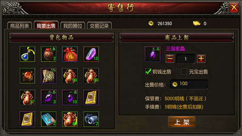 ◆保管费——物品一旦上架就要收取5000金币的保管费用,每次上架收取的保管费都是不变的,不管是卖1个数量的物品还是卖99个数量的物品。