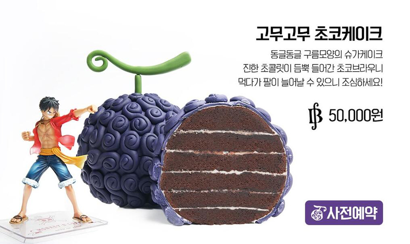 这是一种最近在韩国开售的恶魔果实外形的巧克力蛋糕,每一个售价50000韩元(合270人民币)。不过这种蛋糕显然每天都是限量售卖,先到先得,售完即止。