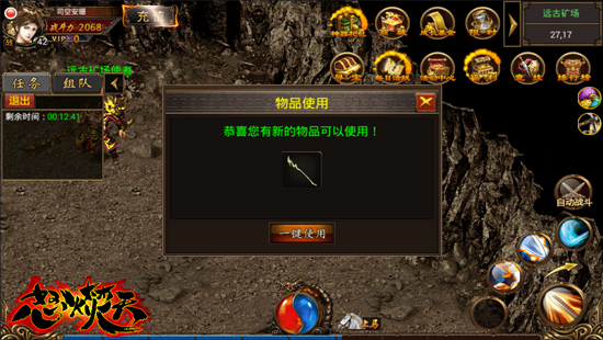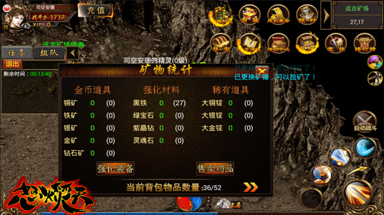 装备上矿锄,玩家就可以在矿洞中自动挖矿啦,挖矿除了挖到大量可以卖钱的金币奖励之外,还能挖到强化石等各种各样的装备强化道具哦。不过挖矿的时间有限,挖出好东西的几率不高,再加上矿锄自身耐久的设定,玩家们想要获得超级道具不是一件容易的事情哦!