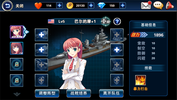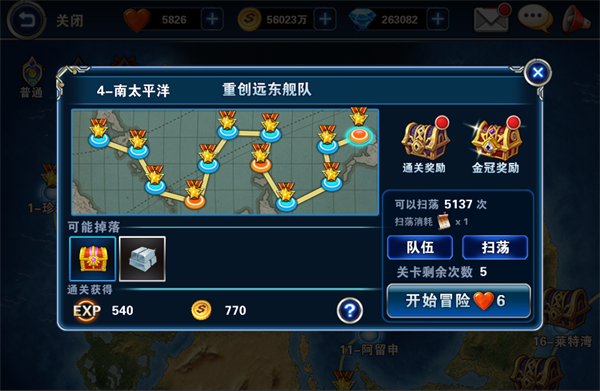 前期提督升级还是很快的,当提督的等级达到5级的时候推本遇到困难,进入队伍界面,用金币给巴尔的摩号的装备进行升级,全部升到跟提督等级一致;再点击内华达号,选择战舰培养,将内华达号的等级提升至当前最高,再进入战斗。 将第一章珍珠港的全部12个小关卡通过后,提督提升至7级,又开启了一个队伍位置,在关卡界面打开通关宝箱和金冠宝箱,可以获得大量物资,其中有一搜蓝色战舰青叶号,还有钻石和用来免费抽奖的建造书。