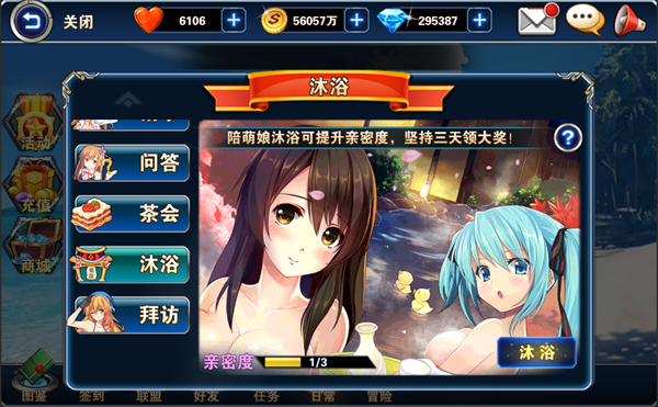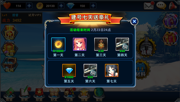 用得到的建造书去商城免费抽一次,获得战舰的话一定要留着。再用战斗经验给青叶号提升等级后,加入战斗队伍,继续推主线关卡。8级时候开启巡航,因为新手第一天是赠送VIP3试用,所以隔一段时间就来个一键巡航,可以获得大量提督经验。 不停的一键巡航可以直接升级到11级,开启了好友和另外一个队伍位,要加好友首先要修改提督名字,可以输入也可以随机选择一个,然后就开始多多的加好友吧,加好友尽量要经常在线的,因为好友除了可以互相赠送体力外,还能互相拜访获得免费钻石和免费抽奖的建造书,好基友一生一起走。另外一个队伍位用之前抽奖的战舰上阵,记得千万升级哦,不然太弱啦。