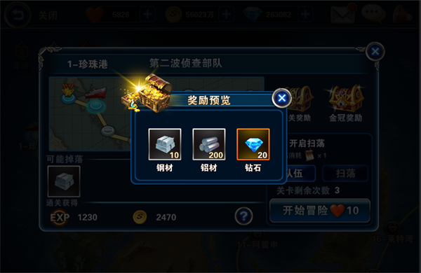 继续推本提督升到12级开启冒险经验副本,尽量往后面打,通关越多越好,然后一键扫荡将所有战斗经验收入囊中。提督13级开启了战舰改造,战舰改造核心可是好东西,提督14级开启了联盟,一定要加入一个好的联盟,联盟太重要了,联盟商城可以用联盟币兑换战舰改造核心,联盟BOSS不仅可以获得联盟经验,联盟币还有击杀钻石,还有击杀宝箱,各种福利停不下来,而且后期联盟跨服PK赛有大量好东西。 继续推本,当通过第二章威克岛后,又可以打开通关宝箱和金冠宝箱,除了获得战舰外,钢材和铝材的获得也非常关键,铝材到装备商城中购买战舰主炮图纸,累计满100个图纸合成战舰主炮,装备升级后战力提升一大截。